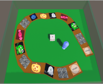 Apply the image start.png to the first tile and finish.png to the last one. Set a number of the other tiles with images of the pumpkin/candy/monsters as you want, and the others as pebbles. Here is an example of a possible result: